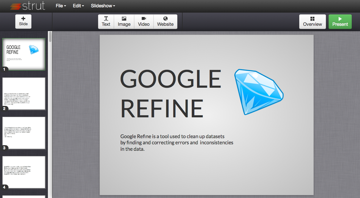 Esta aplicación multimedia crea presentaciones parecidas a las de PowerPoint o Impress. Es una plataforma que permite incorporar texto, imágenes o gráficos sobre un lienzo y agruparlos en marcos. Poco a poco va seleccionando la posición y medida de los objetos, así como su ampliación/alejamiento.