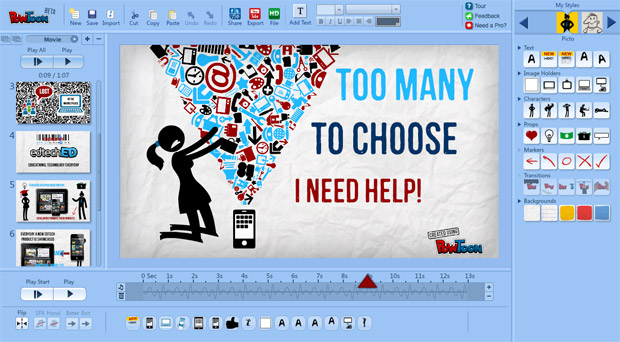 Aunque es un poco complicado para los principiantes ofrece diversas herramientas y tutoriales para familiarizarse con su uso, y crear una presentación agradable. Las caricaturas son el fuerte de esta herramienta, así que si busca algo más serio y empresarial es mejor inclinarse por otra app.